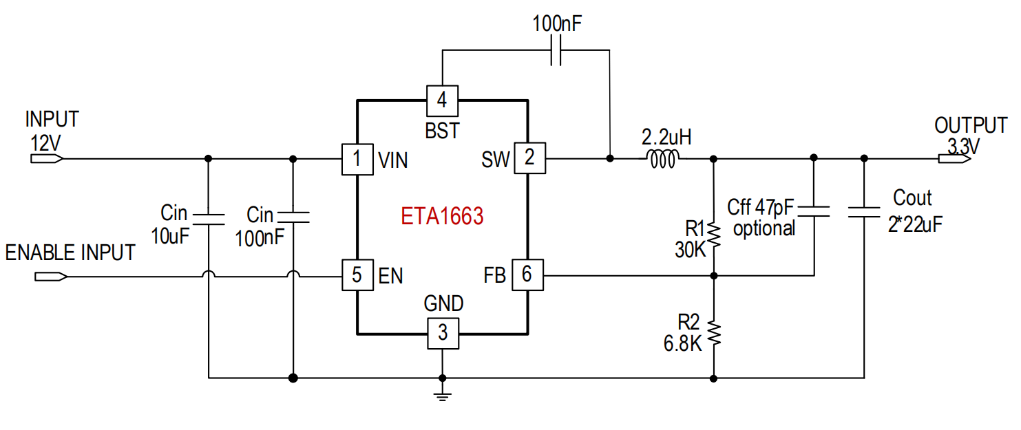 ETA1663 is a wide input range, high efficiency and high frequency DC to DC step-down switching regulator, capable of delivering up to 4A of output current. It adopts an Adaptive COT control scheme that enables very fast transient response and provides a very smooth transition when the output varies from light load to heavy load.