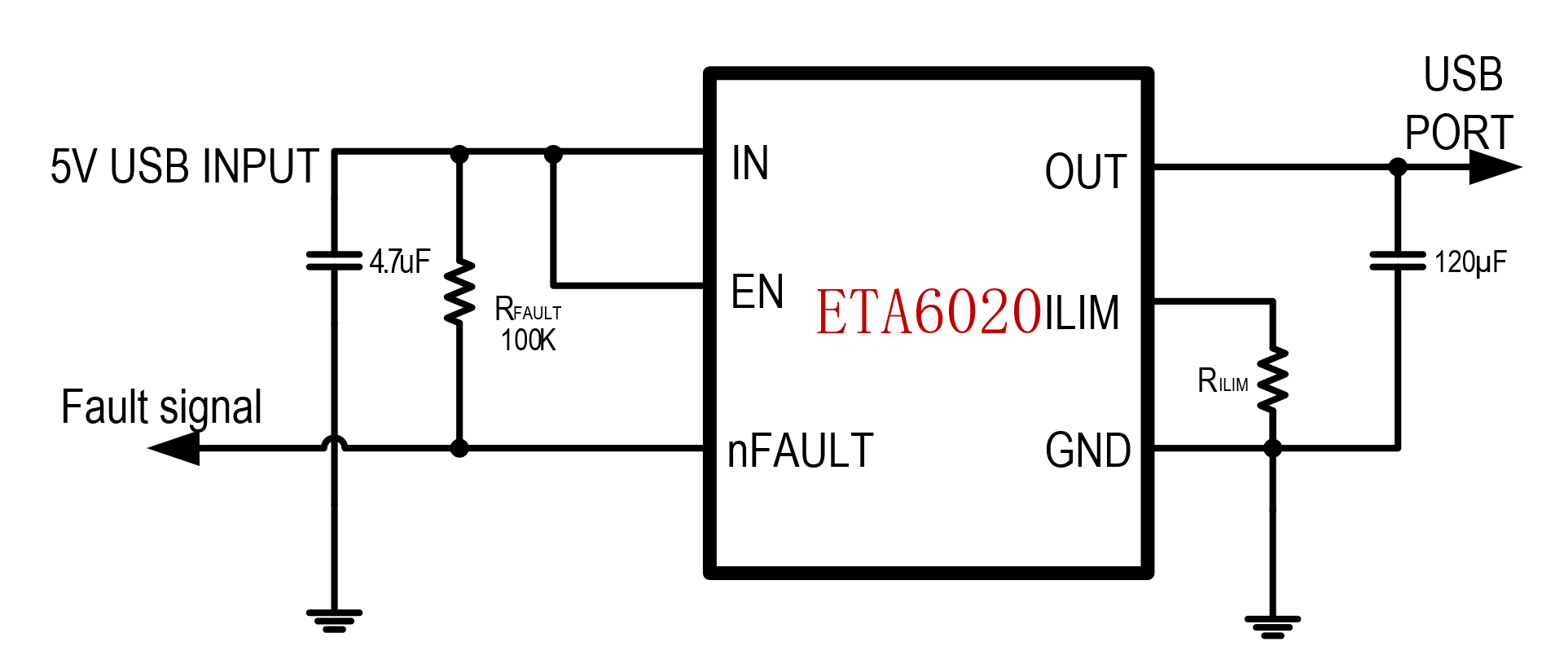 The ETA6020 is a load switch which provides full protection to systems and loads which may encounter large current conditions. ETA6020 offers a 95mΩ current-limited switch which can operate over an input voltage range of 2.5-5.5V. The current limit can be externally programmed by a precision resistor, ranges from 75mA to 1.7A.