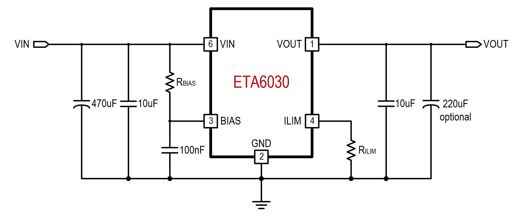 ETA6030 is a current limit switch that provides protection to systems and loads which may encounter large current conditions. It has the function of filtering out the input ripple and providing a low noise stable output voltage. The current limit of the switch can be externally programmed by a resistor.