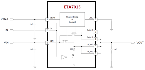 ETA7015 is an ultra-low Ron load switch capable of passing current up to 5A. It employs a unique 2-NMOS switches topology, that an ultra-low on resistance (13mohm) is achieved by connecting the 2 NMOS in parallel (Low Ron mode), or a 55mohm switch with on body diode effect is achieved by connecting the 2 NMOS in series (Reverse Blocking mode).