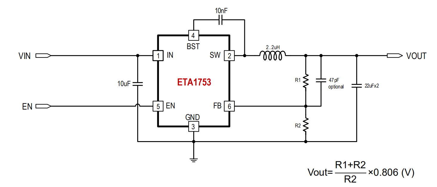 ETA1753 is a wide input range, high-efficiency and 1MHz frequency DC-to-DC step-down switching regulator, capable of delivering up to 3A of output current. It adopts an Adaptive COT control scheme that enables very fast transient response and provides a very smooth transition when the output varies from light load to heavy load.